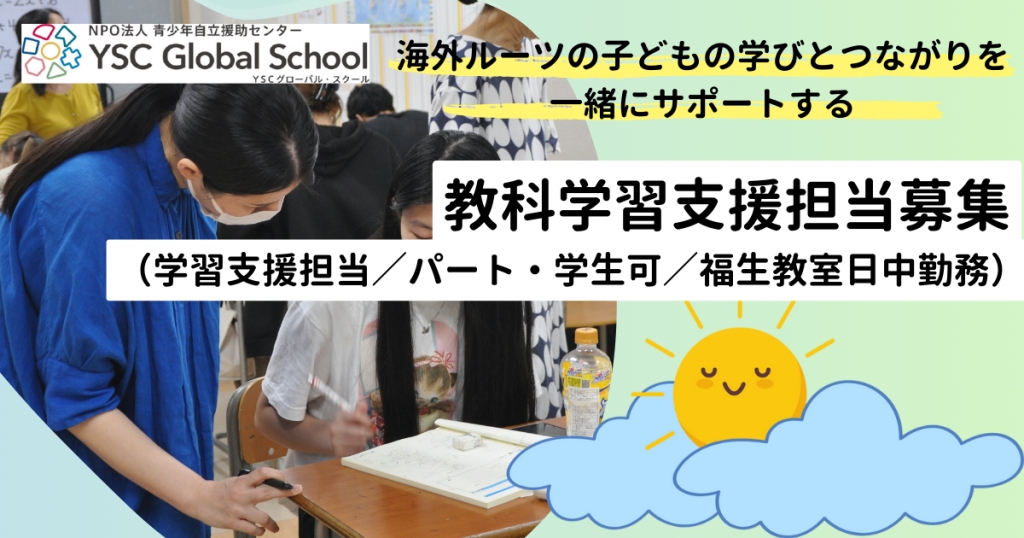 現在こうした子どもたちが「日本語で算数、社会などの教科を学ぶ」ことや、高校入試に自信を持って取り組むめるようサポートする教科学習支援担当者を募集しています!